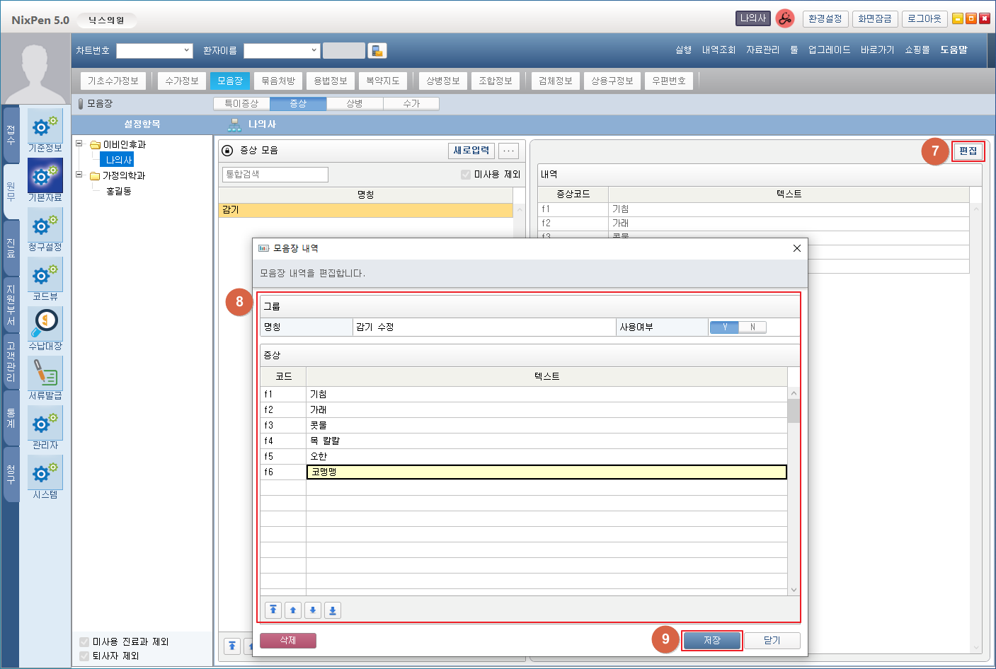 ⑦ [편집] 버튼을 클릭하여 선택된 증상그룹의 편집 창을 팝업 할 수 있습니다.