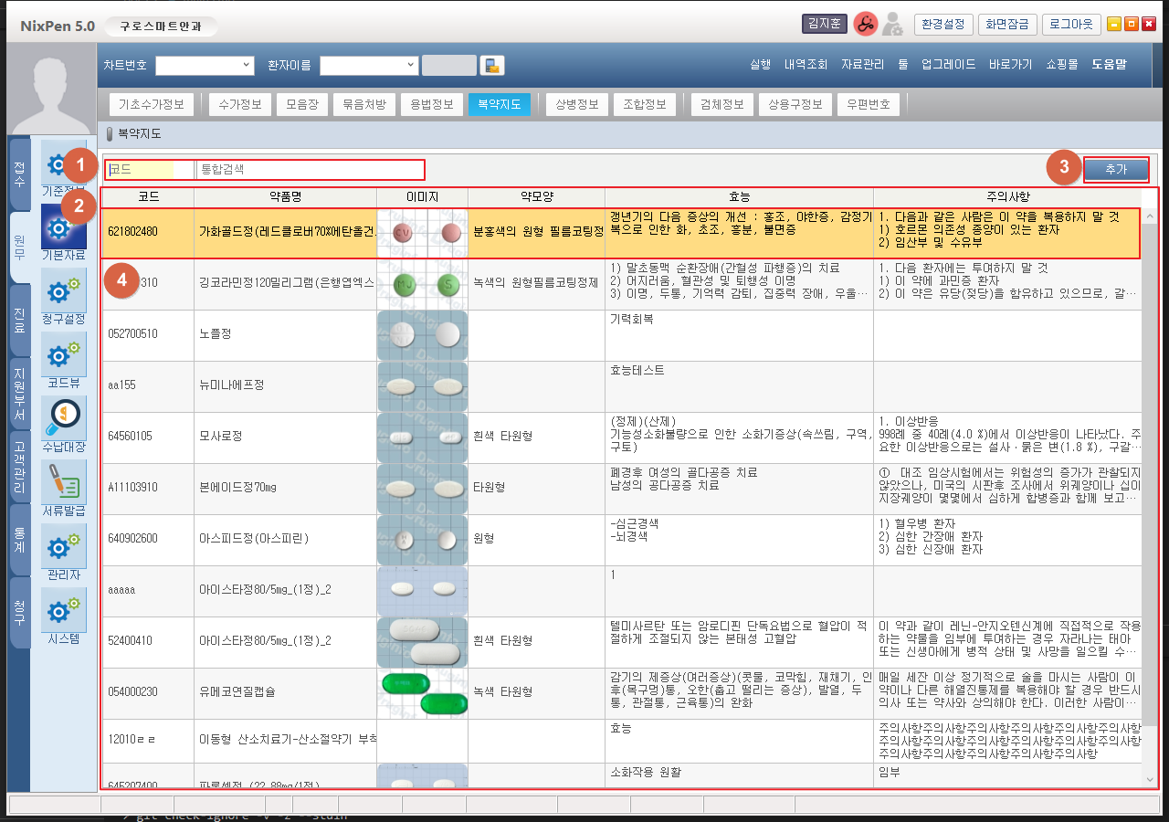 ① 코드, 통합검색으로 복약지도를 검색할 수 있습니다. ② 검색된 복약지도 목록이 표시됩니다. ③ [추가] 버튼 클릭 시 복약지도를 추가할 수 있습니다. ④ 복약지도 목록 선택 후 더블클릭 시 선택한 항목을 수정/삭제할 수 있습니다. 1. 복약지도