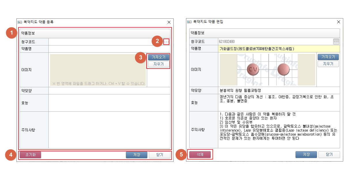 ① 약품 정보가 표시됩니다. ② [...] 버튼 클릭 시 약품 정보를 가져올 수 있습니다. ③ [가져오기] 버튼 클릭 시 이미지를 가져오기 할 수 있습니다. [지우기] 버튼 클릭 시 이미지를 지우기 할 수 있습니다. ④ [초기화] 버튼 클릭 시 약품 정보를 전체 지우기 할 수 있습니다. [저장] 버튼 클릭 시 약품 정보가 저장됩니다. ⑤ 약품 편집 시 [삭제] 버튼이 표시됩니다. [삭제] 버튼 클릭 시 약품 정보가 삭제됩니다. 2. 복약지도 추가/수정