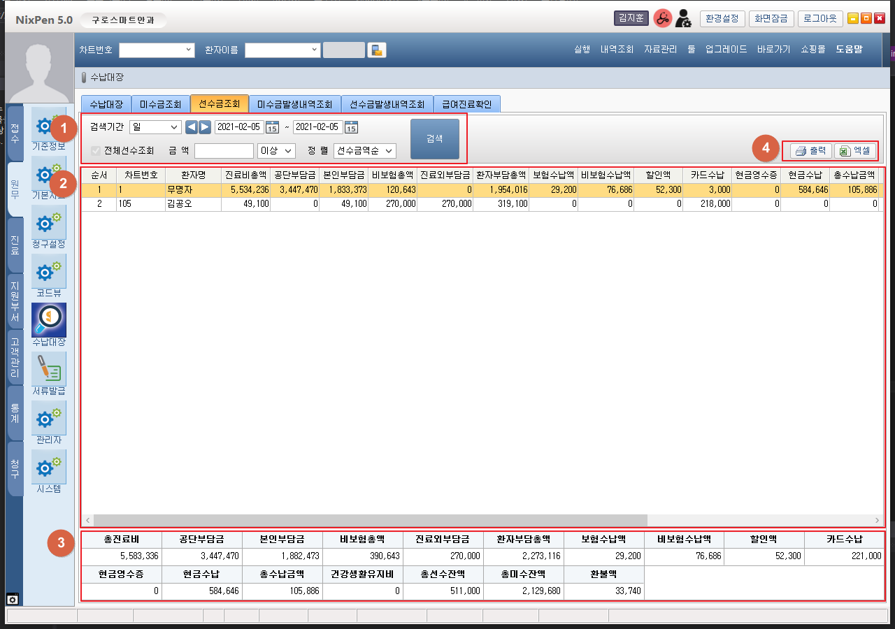 1. 선수금조회 ① 조회 기간 조회 옵션을 설정하고 [검색] 버튼을 클릭합니다. ② 검색된 선수환자 목록이 표시됩니다. ③ 검색된 목록의 합계가 표시됩니다. ④ 검색된 목록을 출력/ 엑셀 다운로드 할 수 있습니다.