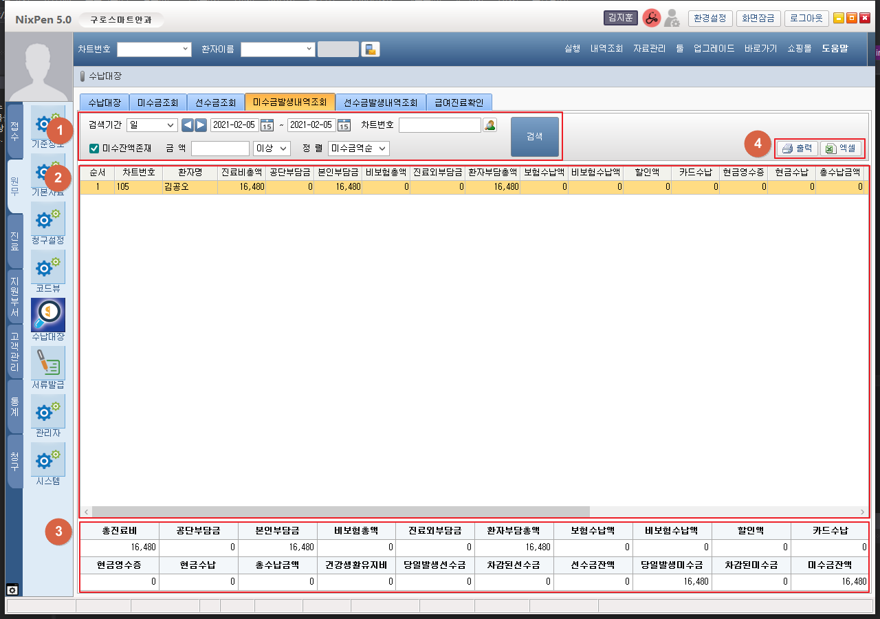 ① 조회 기간 조회 옵션을 설정하고 [검색] 버튼을 클릭합니다. ② 검색된 미수금 발생 목록이 표시됩니다. ③ 검색된 목록의 합계가 표시됩니다. ④ 검색된 목록을 출력/ 엑셀 다운로드 할 수 있습니다. 1. 미수금발생내역조회