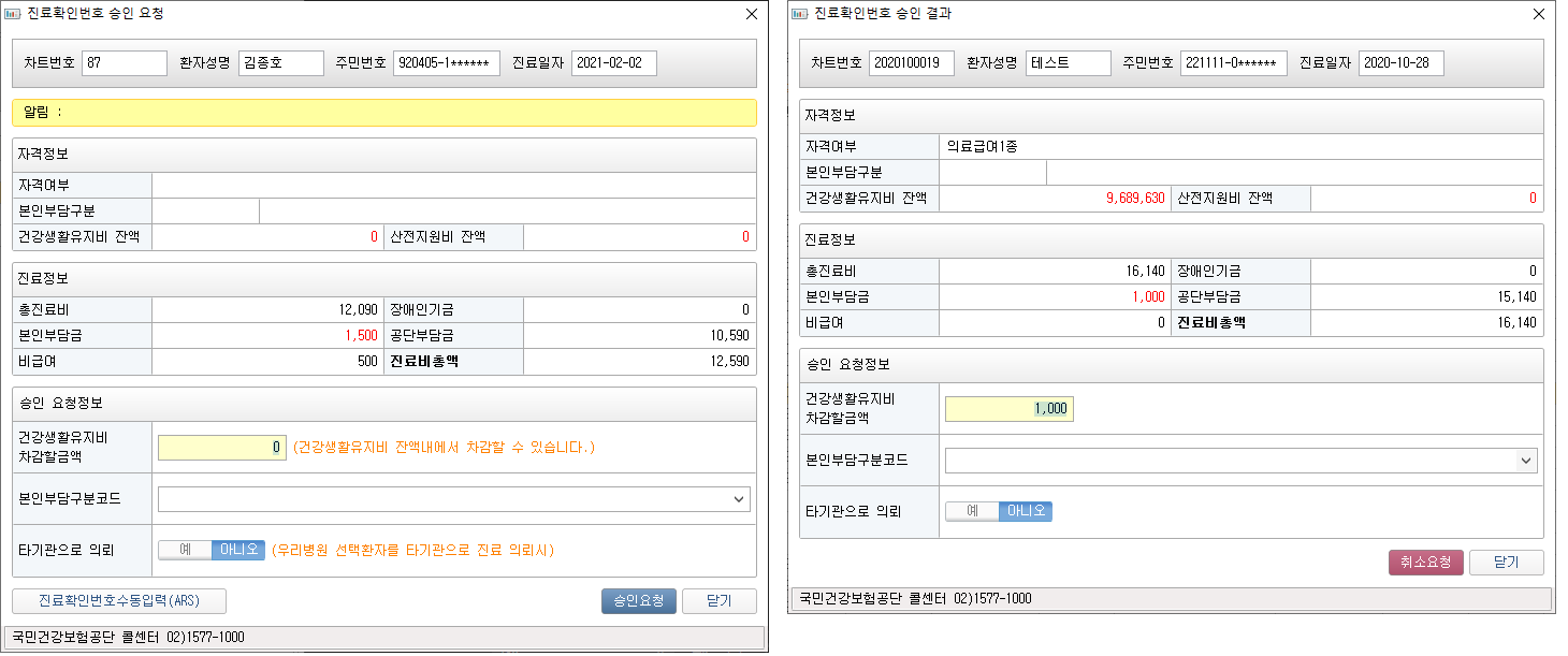 ① 조회 기간 조회 옵션을 설정하고 [검색] 버튼을 클릭합니다. 목록을 더블클릭하여 진료확인번호를 확인할 수 있습니다. 미승인 시 승인창이 승인 시 승인결과창이 표시됩니다. ② 검색된 선수금 발생 목록이 표시됩니다. ③ 검색된 목록의 합계가 표시됩니다. 1. 급여진료확인