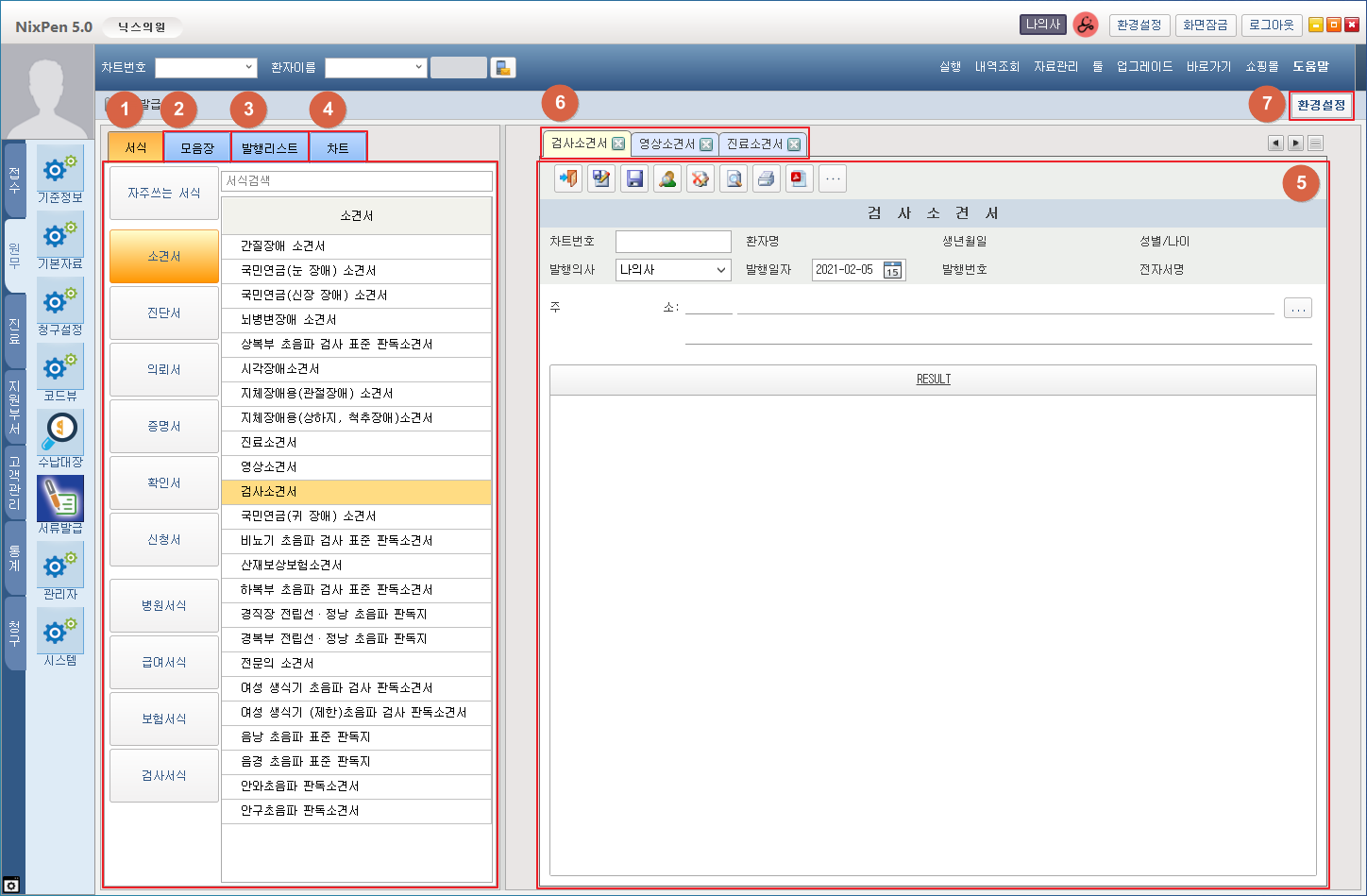 ① 각 항목별 진단서 목록을 보여줍니다. ② 진단서 작성 시 사용할 모음장 목록을 보여줍니다. ③ 발행된 진단서 목록을 보여줍니다. ④ 현재 화면에서 선택된 환자의 진료차트를 보여줍니다. ⑤ 진단서를 작성합니다. ⑥ 현재 열려있는 진단서를 탭으로 나타냅니다. ⑦ 진단서 작성 중 사용되는 환경설정 화면을 연결합니다. 1. 서류발급 화면