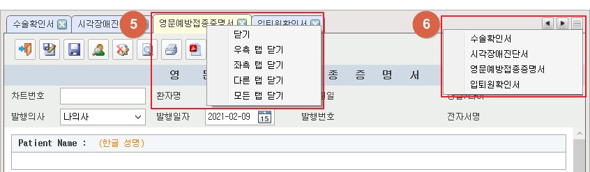 ⑤ 탭을 우클릭 하여 닫기 메뉴를 사용할 수 있습니다.