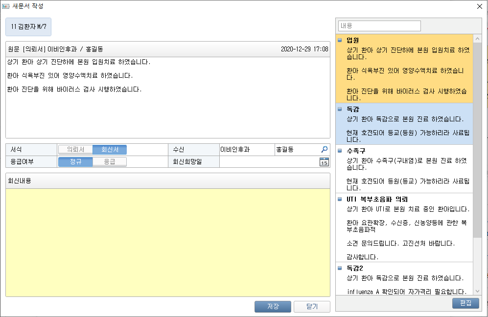 ⑩ [지시] 버튼 클릭 시 검사/방사선/캐스트/물리치료/판독소견셔 작성 창이 팝업됩니다.