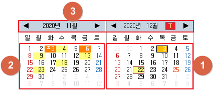 오늘 일자에는 적갈색 테두리가, 선택 일자에는 검정색 테두리가 표시됩니다.