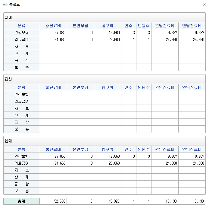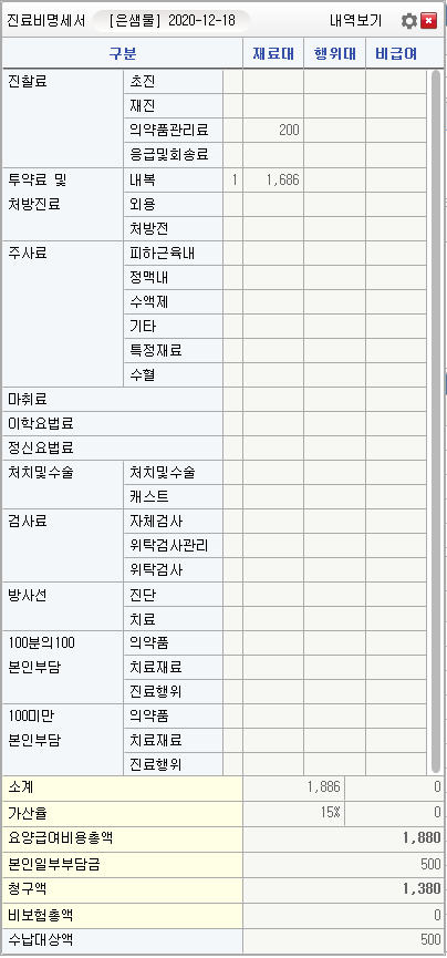 ① [조회] 버튼 클릭 시 조회 조건 창이 팝업 됩니다. 조회 조건 창에서 청구 기간 및 대상 선택 후 확인 버튼을 누르면 회색영역에 선택된 조건이 표시됩니다. ② 선택환자를 체크하면 ⑦번 영역에 현재 조회되어있는 환자의 명세서내역이 표시됩니다. 명세서보기에 체크되어있는 경우 리뷰 시 전처방 영역에 진료비 명세서 화면이 표시됩니다. 리뷰에 체크되어있는 경우 목록 더블클릭 시 리뷰된 것으로 체크됩니다. ③ [총괄표] 버튼 클릭 시 총괄표 창이 팝업됩니다. ④ [...] 버튼 클릭 시 컨텍스트 메뉴가 열립니다. [명세서 출력] 메뉴 클릭 시 명세서 출력 창이 팝업됩니다. 출력 범위 지정 후 [출력] 버튼 클릭 시 명세서가 즉시 출력됩니다. ⑤ 명세서 목록에서 더블클릭 시 환자를 불러옵니다. 리뷰된 내역은 체크박스에 체크되고 하늘색으로 배경색이 표시됩니다. 메모가 입력되어있는 경우 체크박스 우측에 붉은 표지가 표시됩니다. 체크를 해제할 경우 배경색이 사라집니다. ⑥ 목록 우클릭 시 컨텍스트 메뉴가 열립니다. [메모] 메뉴 클릭 시 리뷰 메모 입력 창이 팝업됩니다. [내 리뷰기록 초기화] 메뉴 클릭 시 리뷰된 것으로 표시된 내역이 모두 초기화 됩니다. [리뷰 대상 내역만 보기] 메뉴 클릭 시 목록에 리뷰됨으로 체크되지 않은 내역만 표시됩니다. [전체 내역 보기] 메뉴 클릭 시 리뷰 여부와 관계없이 전체 내역이 표시됩니다. ⑦ ②번 영역의 선택환자에 체크 되어있는 경우 표시됩니다. 현재 조회되어있는 환자의 명세서내역이 표시됩니다. 3. 청구