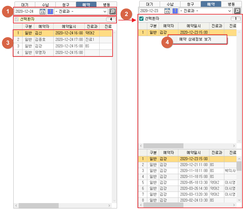 ① 날짜를 선택하여 예약 목록을 검색할 수 있습니다. [T] 버튼 클릭 시 선택 날짜가 오늘로 변경됩니다. 진료과를 선택하여 예약 목록을 검색할 수 있습니다. 검색조건 변경 시 즉시 검색됩니다. 검색 버튼 클릭 시 검색조건 변경 없이 검색할 수 있습니다. ② 선택환자 체크 시 목록하단에 현재 조회되어있는 환자의 예약내역이 표시됩니다. 회색 영역 안 숫자는 예약 건 수 입니다. ③ 목록에서 더블클릭 시 선택환자를 불러옵니다. ④ 목록에서 우클릭 시 컨텍스트 메뉴가 열립니다. [예약 상세정보 보기] 메뉴 클릭 시 선택된 예약 내역에 대한 예약 상세 수정 창이 팝업됩니다. 4. 예약