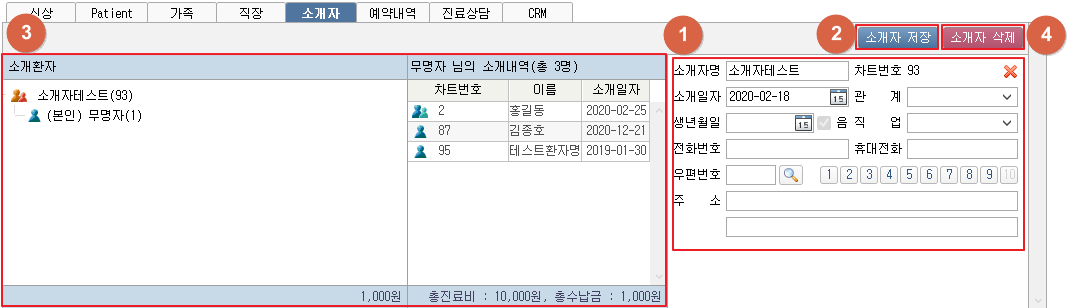 ① 소개자를 불러와 정보를 입력합니다. ② [소개자 저장] 버튼을 클릭하여 소개자를 저장합니다. ③ [소개자 삭제] 버튼을 클릭하여 저장한 소개자를 삭제합니다. ④ 소개환자 정보와 소개환자가 소개한 소개자를 확인할 수 있습니다. 5. 소개자