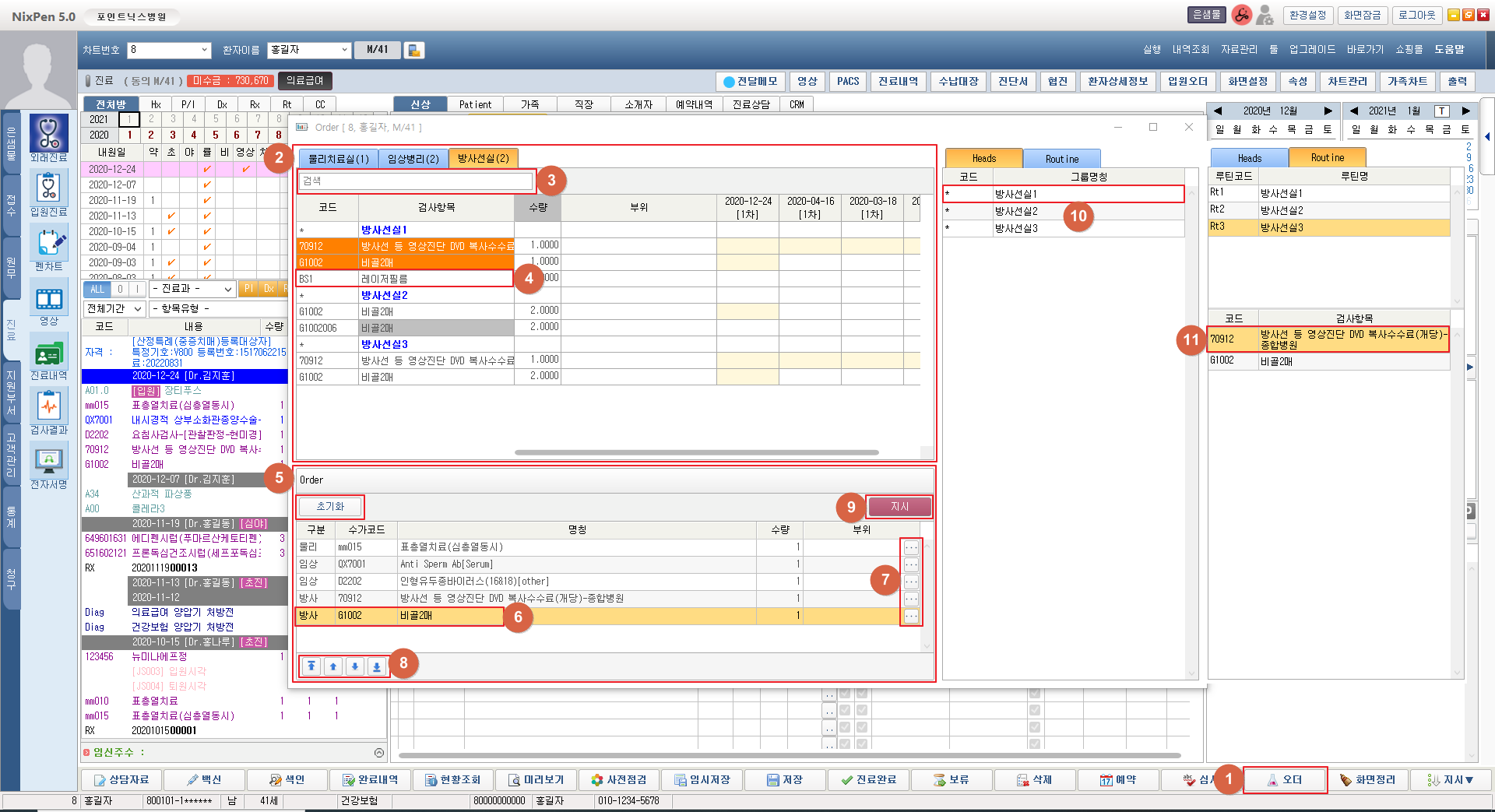 ⑨ [지시] 버튼을 클릭하여 진료차트에 추가할 수 있습니다.