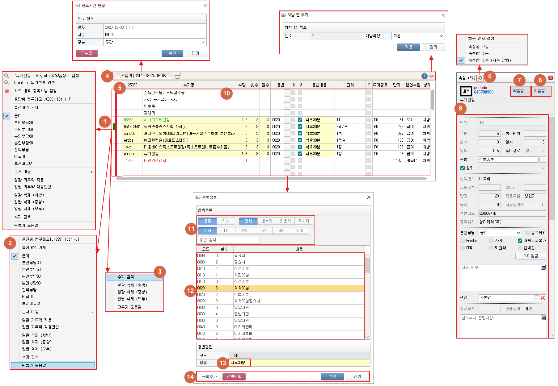 ① 의약품 처방에서 컬럼 클릭 시 컨텍스트 메뉴가 열립니다.