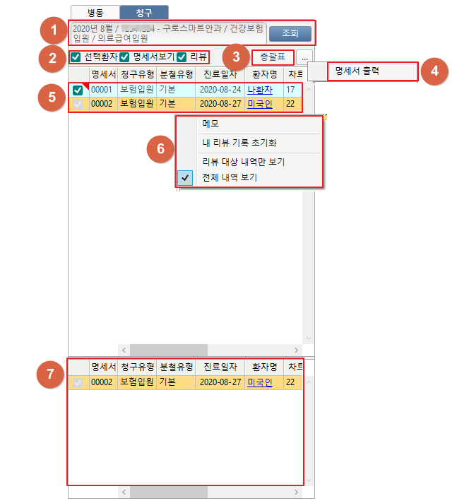 ② 선택환자를 체크하면 ⑦번 영역에 현재 조회되어있는 환자의 명세서내역이 표시됩니다.