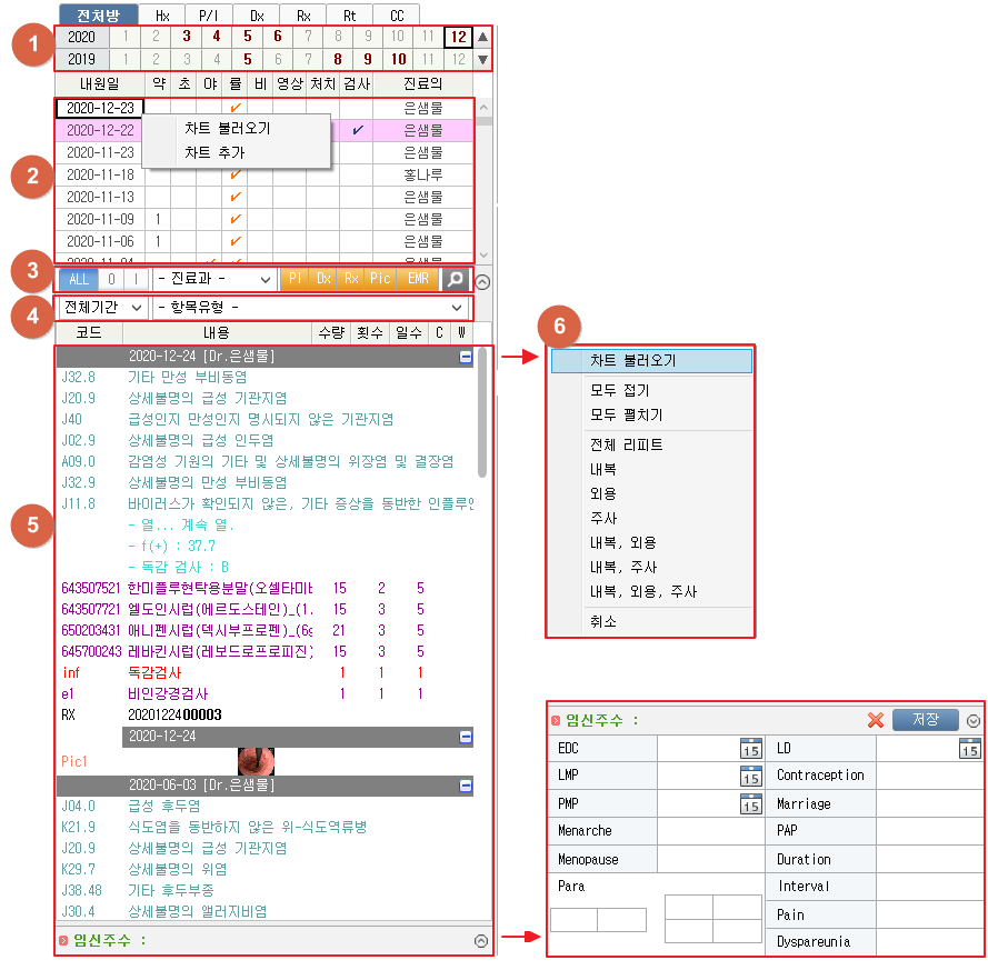 ⑥ [차트 불러오기] 메뉴 클릭 시 선택된 진료내역에 해당하는 차트를 불러옵니다.