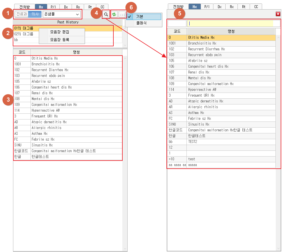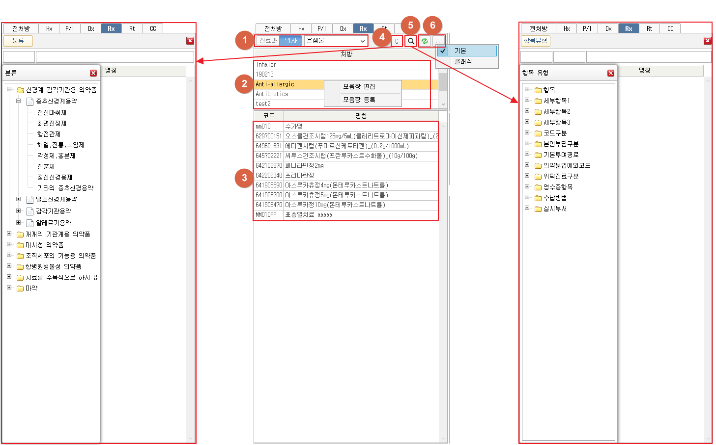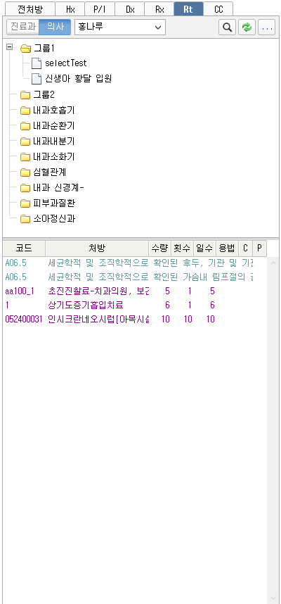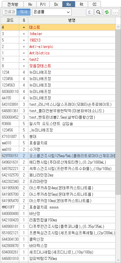 ② 모음장 그룹 클릭 시 하단에 해당 모음장에 등록되어있는 처방이 표시됩니다.