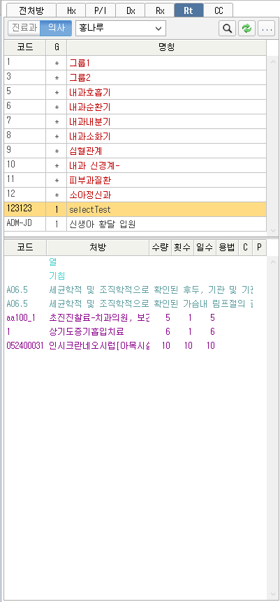 항목유형 선택 시 선택된 유형에 따라 처방을 검색하여 목록으로 표시합니다.