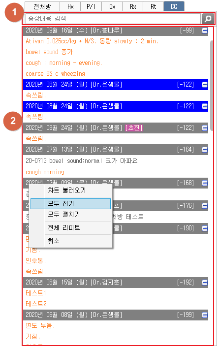 진료내역의 날짜와 진료의사가 표시된 바 우클릭 시 컨텍스트 메뉴가 열립니다.