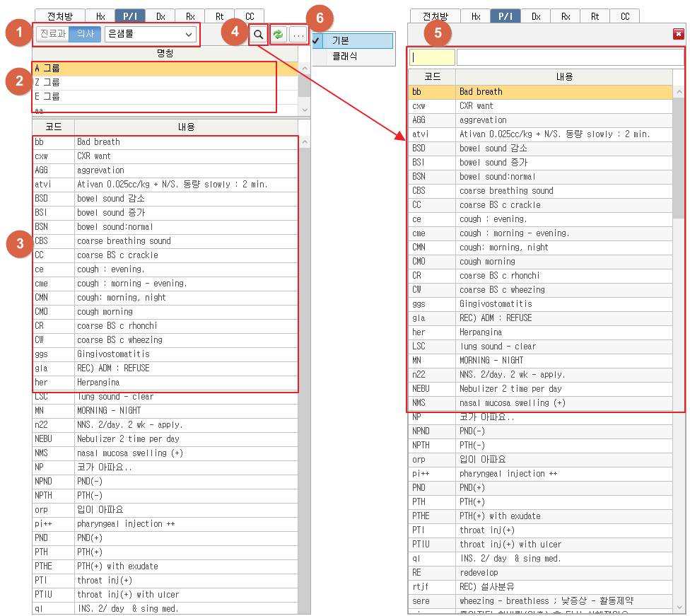 ⑤ 버튼 클릭 시 항목유형별 처방 검색화면이 표시됩니다. [x] 버튼 클릭 시 화면이 닫힙니다.