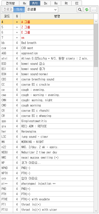 ④ 상병, 처방, 증상 클릭 시 진료차트에 리피트됩니다.