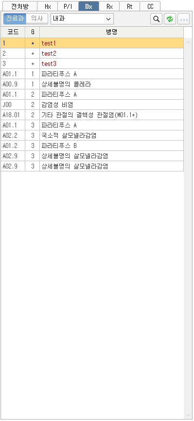④ 현재 선택된 상병의 코드 앞 세자리를 기준으로 검색된 상병이 표시됩니다.