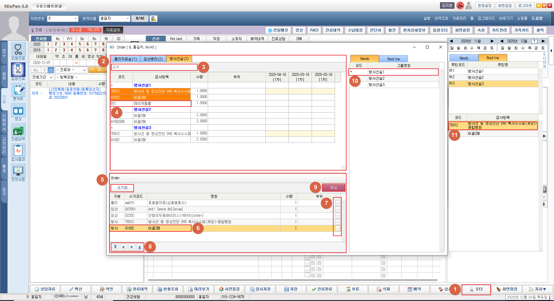 ① [오더] 버튼을 클릭합니다. ② 실시부서 별 검사코드 목록을 확인합니다. ③ 검색어를 입력하여 검색 할 수 있습니다. ④ 코드, 검사항목을 선택하여 Order목록에 추가할 수 있습니다. ⑤ 지시목록을 확인합니다. ⑥ 지시목록을 더블클릭하여 Order목록에서 제거할 수있습니다. ⑦ [...] 버튼을 클릭하여 부위를 선택할 수 있습니다. ⑧ 순서이동을 할 수 있습니다. ⑨ [지시] 버튼을 클릭하여 진료차트에 추가할 수 있습니다. ⑩ Heads 목록을 선택하여 ②의 Head위치로 이동합니다. ⑪ Routine 목록을 더브클릭하여 지시목록에 추가할 수 있습니다. 1. 오더창 검사지시