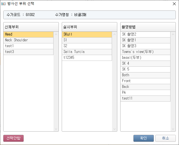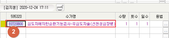 ① 수가정보에서 실시부서를 선택해줍니다. ② 진료차트에서 입력합니다. 2. 직접입력