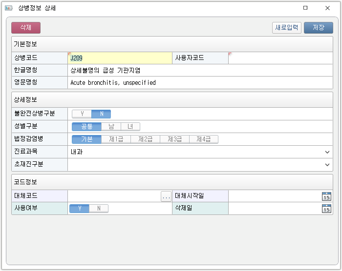 [삭제] 메뉴 클릭 시 선택된 상병이 삭제됩니다.