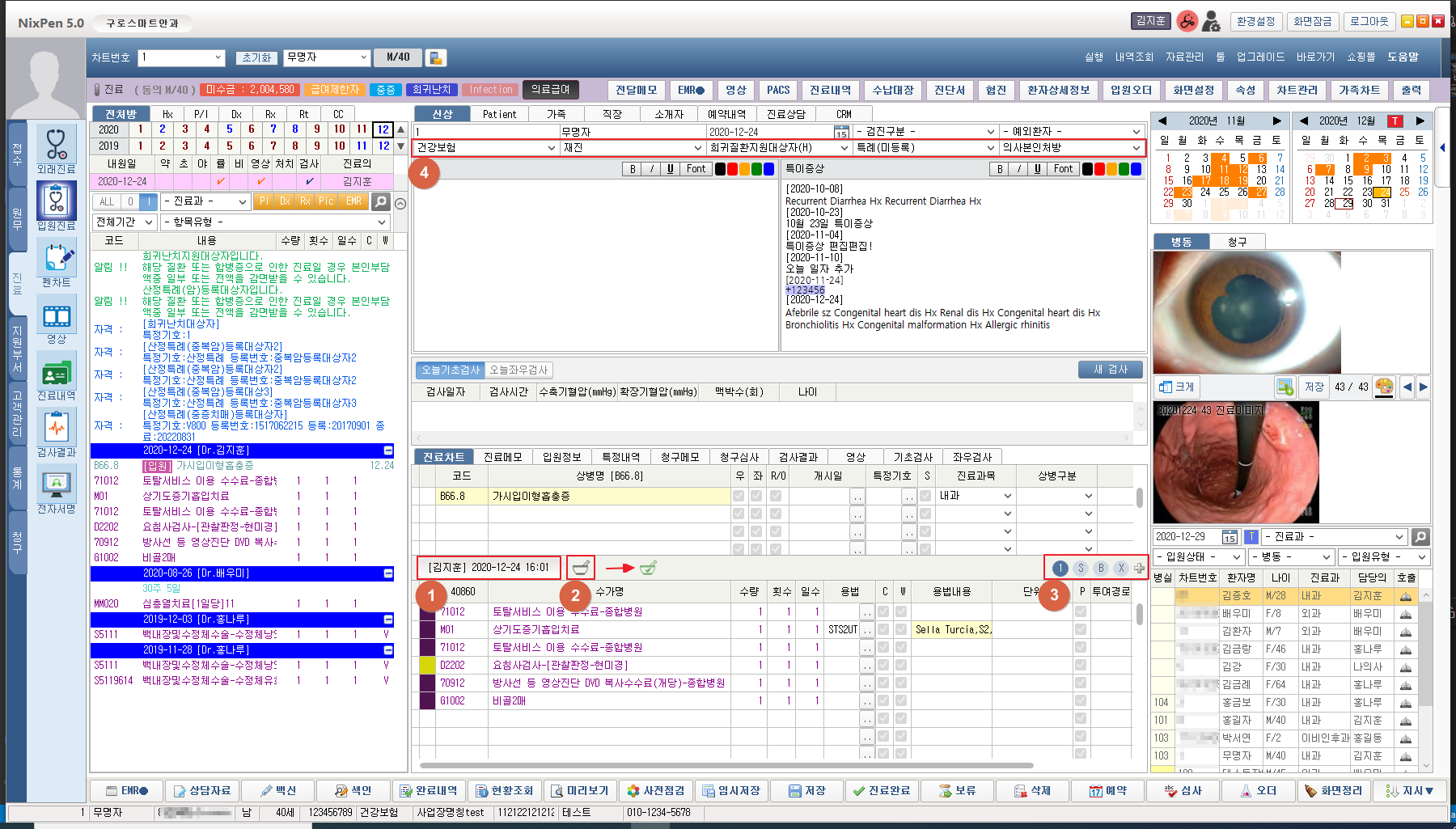 ① 진료의사, 진료일시 정보를 표시합니다. 진료일시를 클릭 시 진료일시 변경 창이 팝업됩니다. ② 가루약 처방여부를 표시합니다. [ 1. 진료정보 ] 버튼을 클릭하여 가루약 처방/처방안함 변경할 수 있습니다. ③ 차트 처방유형 및 차트개수를 표시합니다. [+] 버튼을 클릭하여 처방을 추가할 수 있습니다. ④ 진료의 보험구분, 초재진구분, 등록구분, 진료구분, 산정구분을 확인 및 변경할 수 있습니다. 진료구분에 따라 진찰료 산정이 달라집니다.
