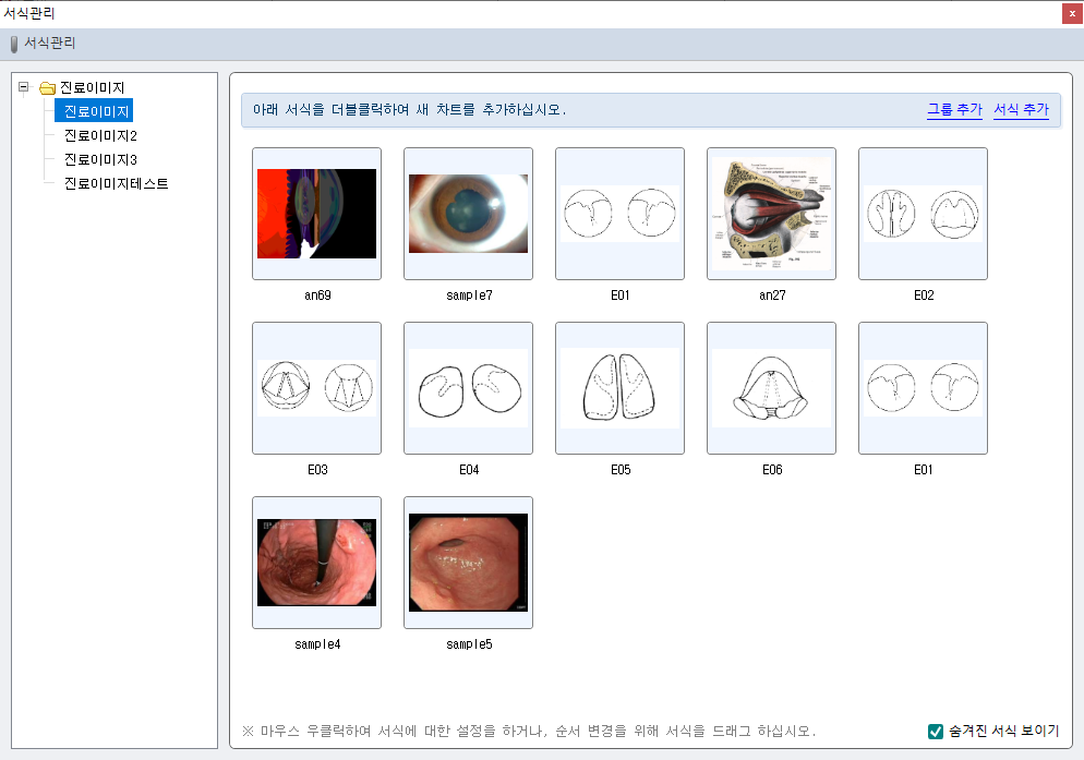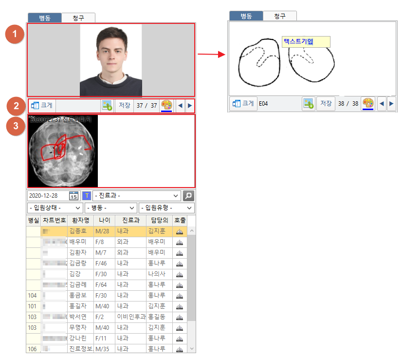 ① 환자사진 및 서식이 표시됩니다. 우클릭시 텍스트를 기입할 수 있습니다. 서식에 그림을 그릴 수 있습니다. ② [크게] 버튼을 클릭하여 진료이미지 크게보기 창이 팝업합니다. [ 1. 진료이미지 ] 버튼을 클릭하여 서식을 지정, 서식을 추가할 수 있습니다. [저장] 버튼을 클릭하여 편집한 진료이미지를 저장 할 수 있습니다. [