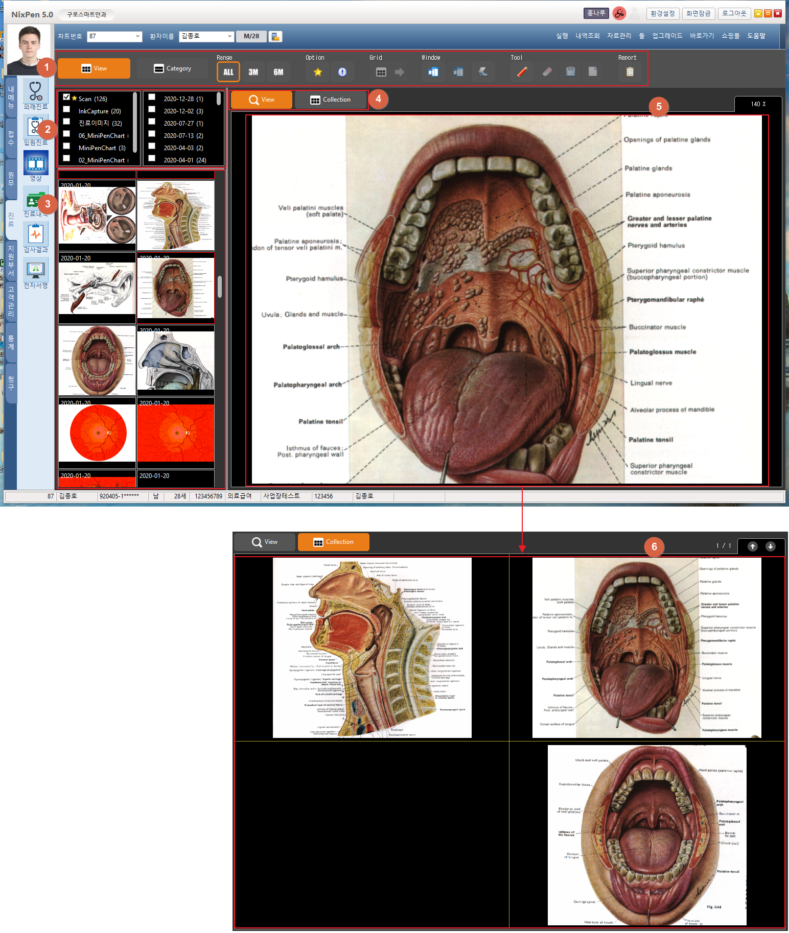 ① 기능버튼을 사용할 수 있습니다. ② 카테고리 또는 날짜를 선택합니다. 선택값 기준으로 영상 목록을 ③ 영역에 표시합니다. ③ 영상 목록을 썸네일로 표시합니다. 영상을 선택하여 ⑤ 영역에 표시하거나 우클릭 시 영상 비교 창이 팝업됩니다. ④ [View] 버튼이 선택되어있는 경우 ⑤ 영역에 마지막으로 선택한 영상이 표시됩니다. [Collection] 버튼이 선택되어있는 경우 ⑥ 영역에 추가한 이미지가 표시됩니다. ⑤ 영상목록에서 마지막으로 선택한 영상이 표시됩니다. 마우스 휠을 사용하여 확대하여 볼 수 있습니다. ⑥ 영상목록에서 드래그 하여 표시할 영상을 추가할 수 있습니다. 1. View