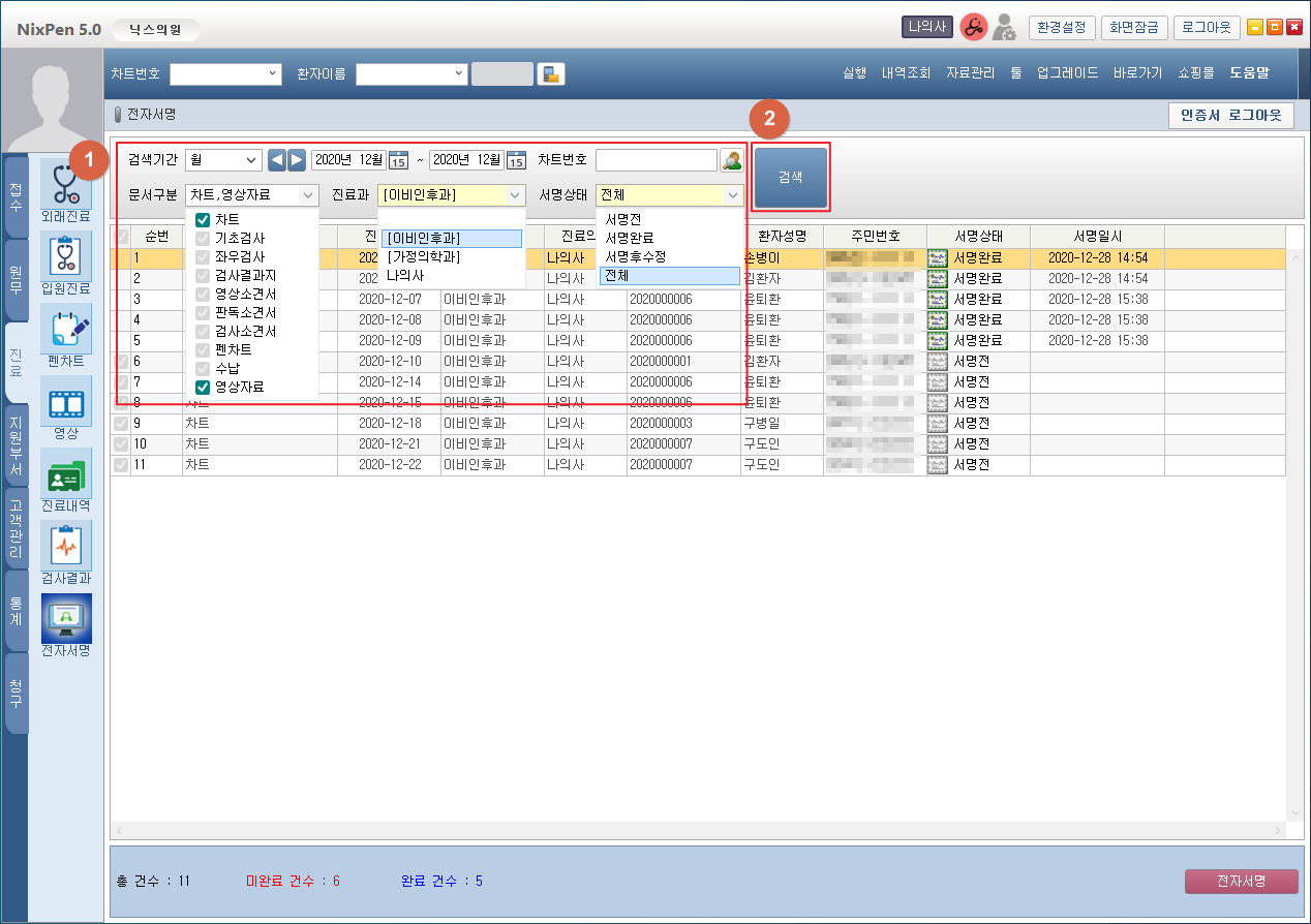 ① 검색조건을 선택합니다. ② [검색] 버튼을 클릭합니다. 1. 대상문서 검색