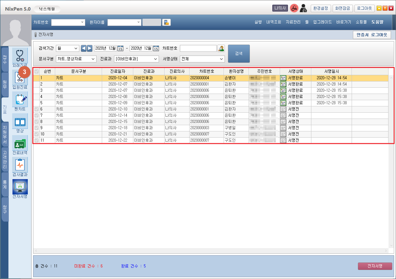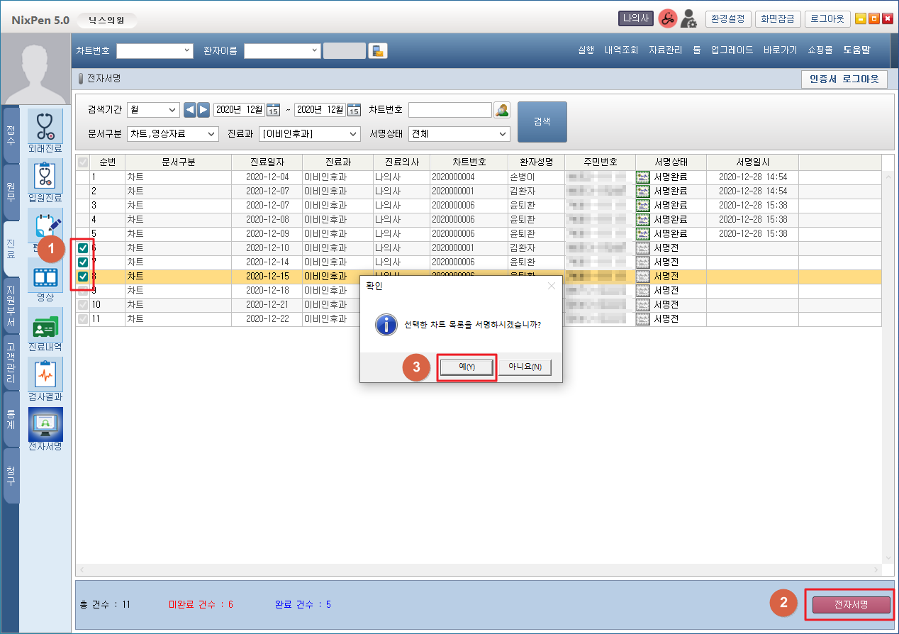 ① 전자서명 승인을 진행할 문서를 체크합니다. ② [전자서명] 버튼을 클릭합니다. ③ [예(Y)] 버튼을 클릭합니다. 2. 여러 문서 승인
