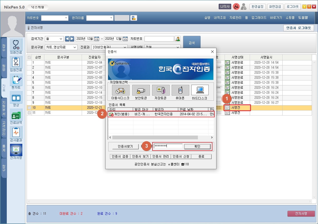 ① 전자서명 승인을 진행할 내역의 [ 3. 단일 문서 승인 ] 부분을 클릭합니다. ② 인증서를 선택합니다. ③ 비밀번호를 입력 후 [확인] 버튼을 클릭합니다.