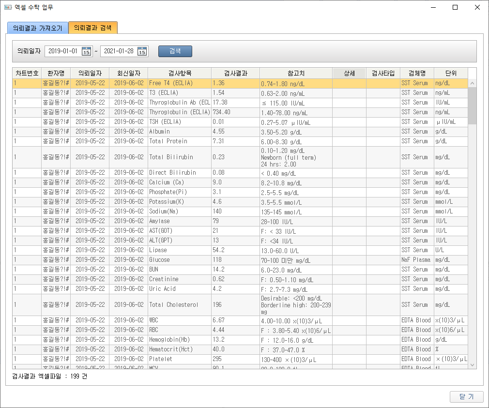 의뢰결과 가져오기 탭에서는 검사결과 엑셀 파일을 불러와 검사결과를 저장할 수 있습니다.