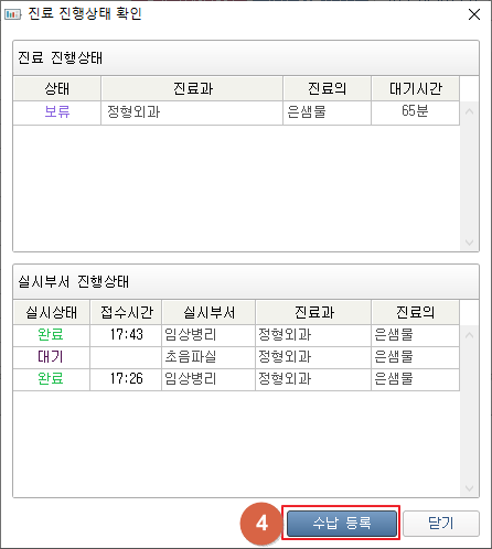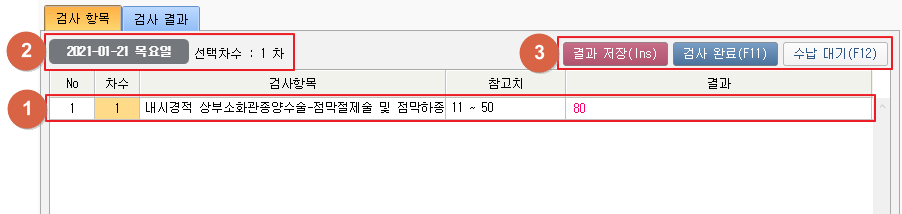 ① 환자의 해당일자 오더목록을 표시합니다. 결과 컬럼에서 결과값을 입력합니다. 우클릭 하여 해당 차수 검사완료/전체 검사완료를 진행할 수 있습니다. ② 선택한 일자 및 선택 차수를 확인합니다. ③ [결과 저장] 버튼 클릭 시 입력한 결과가 저장됩니다. [검사 완료] 버튼 클릭 시 오더수행상태를 완료로 변경합니다. [수납대기] 버튼 클릭 시 오더수행상태를 완료로 변경 후 진료 진행상태 확인 창이 팝업됩니다. ④ [수납] 버튼 클륵 시 수납상태를 보류에서 완료상태로 변경합니다. 1. 대기자 현황