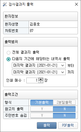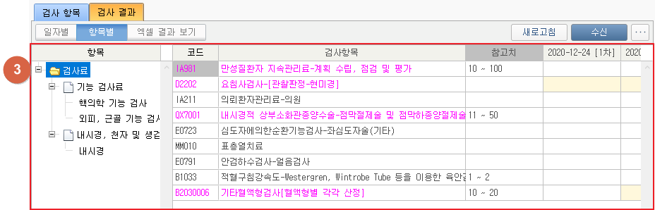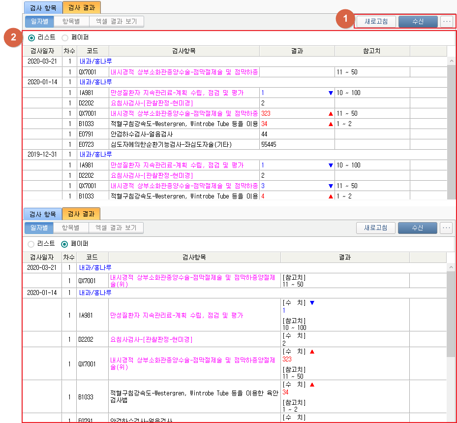 ① [새로고침] 버튼 클릭 시 검사결과 목록을 새로고침합니다. [수신] 버튼 클릭 시 수탁검사 정보를 수신합니다. [...]버튼 클릭 후 [검사결과지 출력] 컨텍스트 메뉴 클릭 시 검사결과지 출력 창이 팝업됩니다. ② 환자의 검사결과 목록을 일자별로 표시합니다. 리스트 / 페이퍼 형식으로 볼 수 있습니다. ③ 환자의 검사결과 목록을 항목별로 표시합니다. ④ 엑셀파일을 불러와 저장한 검사결과를 목록으로 표시합니다. 1. 검사결과