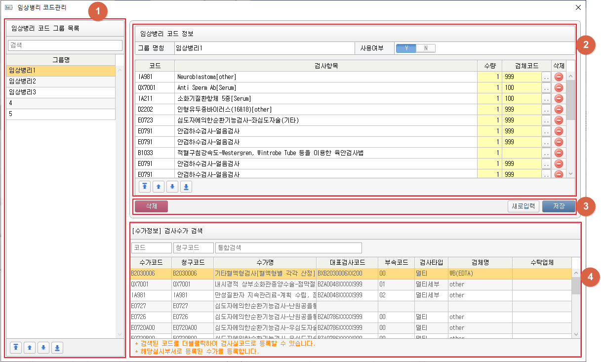 ④ 수가정보에 등록한 검사 코드를 검색할 수 있습니다.