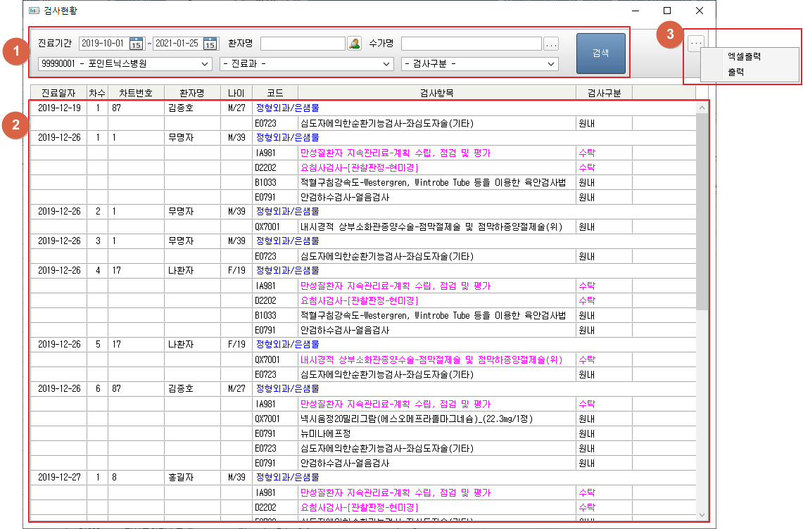 ③ [...] 버튼을 클릭하여 검색한 검사 현황 목록을 출력하거나 엑셀로 다운받을 수 있습니다.