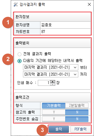 ③ [출력] 버튼을 클릭하여 검사결과지를 출력 할 수 있습니다.