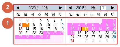 ① 환자의 진료기록이 있을 경우 주황색으로 표시됩니다. 환자의 실시부서 오더가 있을경우 분홍색으로 표시됩니다. 날짜를 더블클릭하면 해당 일자의 물리치료 오더를 불러올 수 있습니다. ② 화살표 버튼 클릭 시 전월/익월로 이동합니다. [T] 버튼 클릭 시 오늘 일자로 이동합니다. 년도 클릭 시 컨텍스트 메뉴를 통해 선택한 년도로 이동할 수 있습니다. 달 클릭 시 컨텍스트 메뉴를 통해 선택한 달로 이동할 수 있습니다. 1. 달력