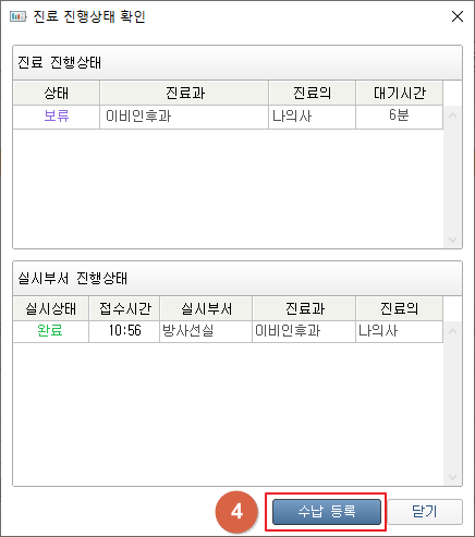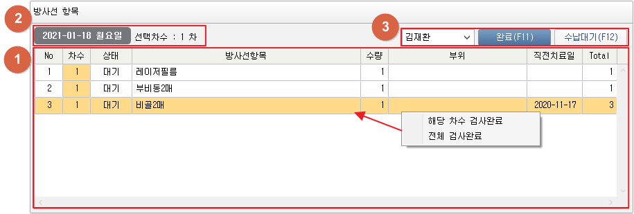 ① 환자의 해당 일자 오더목록을 표시합니다. 우클릭하여 해당 차수 검사완료/전체 검사완료를 진행할 수 있습니다. ② 선택한 일자 및 선택 차수를 확인합니다. ③ 실시자를 선택 후 [완료],[수납대기] 버튼을 클릭하여 실시현황을 변경합니다. [완료] 버튼 클릭 시 오더수행상태를 완료로 변경합니다. [수납대기] 버튼 클릭 시 오더수행상태를 완료로 변경 후 진료 진행상태 확인 창이 팝업합니다. ④ [수납] 버튼 클릭 시 수납상태를 보류에서 완료 상태로 변경합니다. 1. 방사선 항목