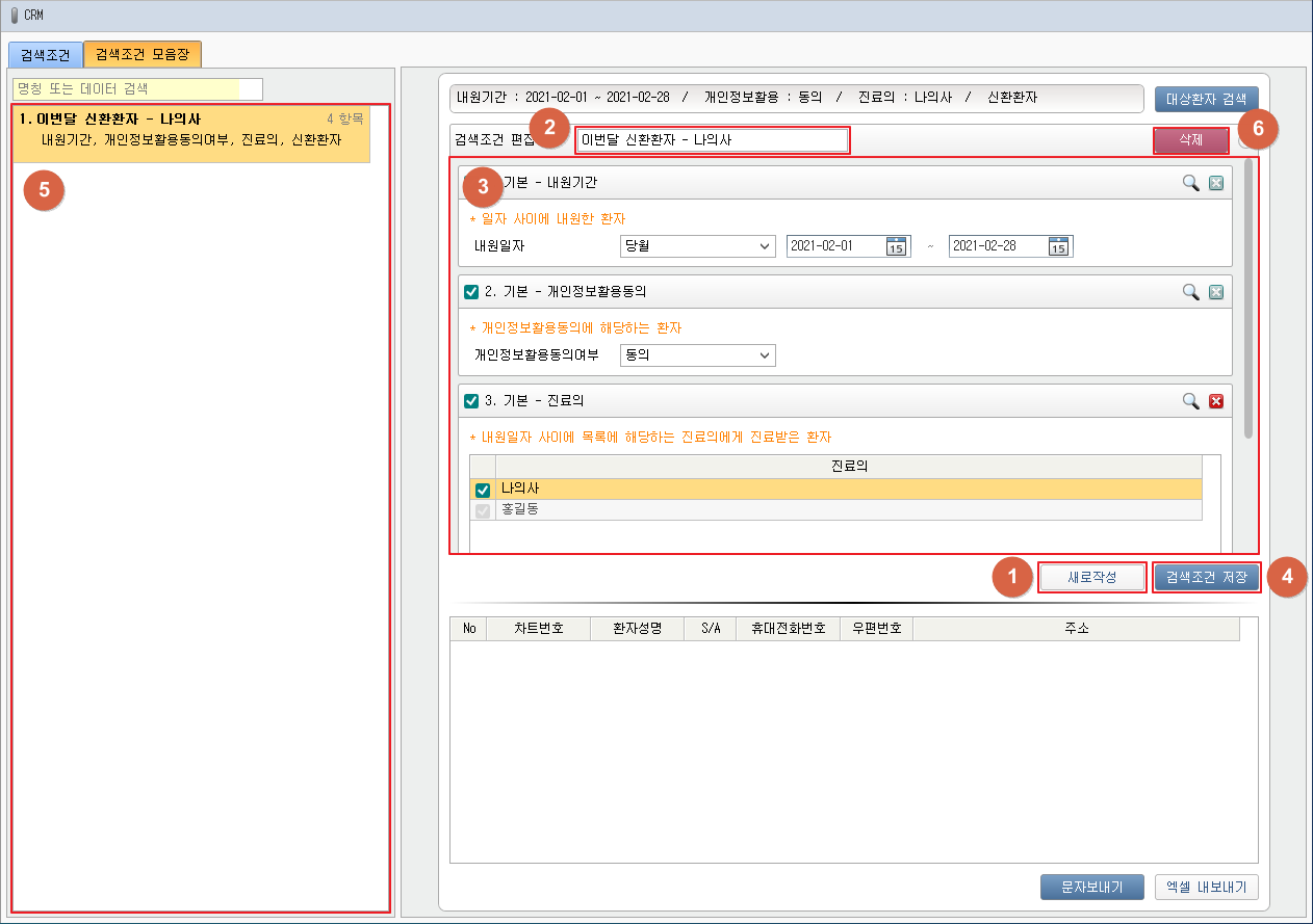 ① [새로작성] 버튼을 클릭합니다. ② 검색 조건명을 입력합니다. ③ 저장하고자 하는 검색조건을 추가 및 편집합니다. ④ [검색조건 저장] 버튼을 클릭합니다. ⑤ [검색조건 모음장] 탭에서 저장된 검색조건을 확인 합니다. ⑥ [삭제] 버튼을 클릭하여 현재 검색조건을 삭제할 수 있습니다. 1. 검색조건 저장