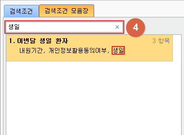 ① [검색조건 모음장] 탭을 선택합니다. ② 불러오고자 하는 검색조건을 더블클릭합니다. ③ 선택한 검색조건이 적용됩니다. ④ 모음장 명칭 또는 포함된 데이터를 기준으로 검색할 수 있습니다. 2. 검색조건 불러오기