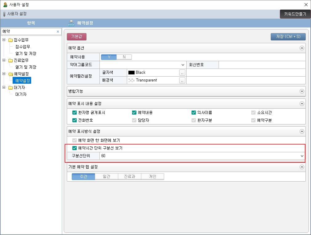 2) [예약시간 단위 구분선 보기] 항목 선택 후 [구분선 단위(30분/60분)] 설정