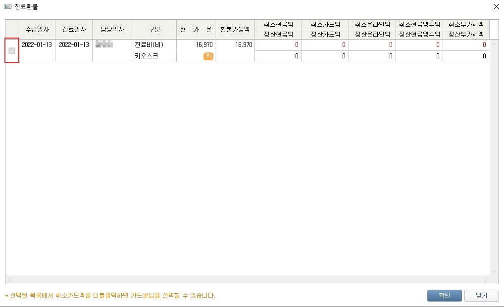 원무 - 진료환불창에서 키오스크 수납건 동작 변경