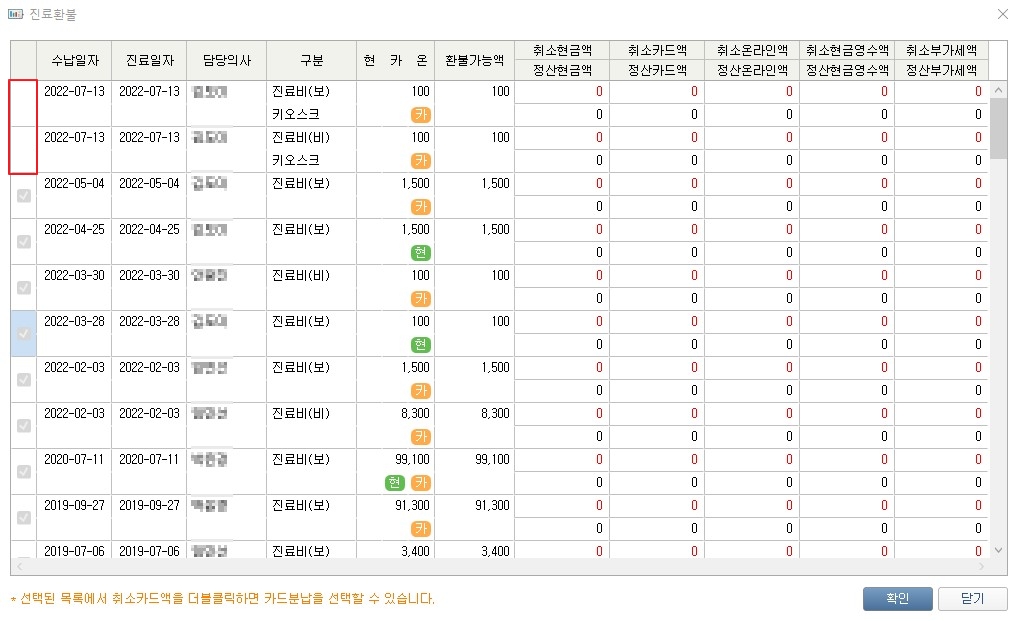 [ 진료환불창에 키오스크 표시 화면 - 다건 ]