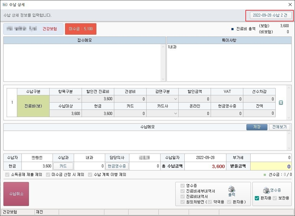 3) 대상 일자에 다른 수납 건이 존재하는 경우 우측 상단에 [일자 별 수납 건수] 버튼 표시