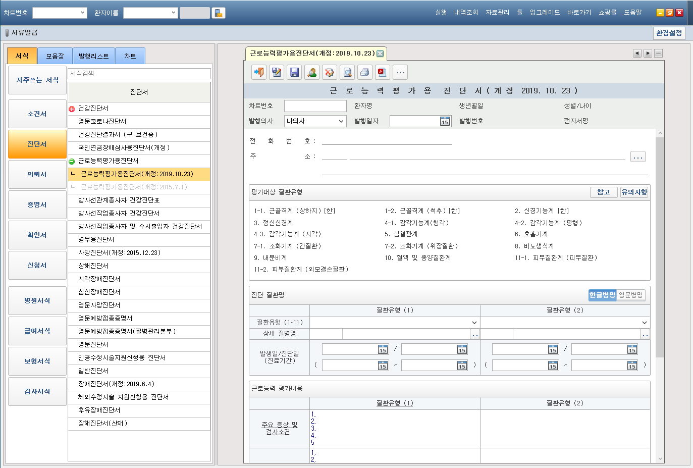 [ 근로능력평가용진단서(개정:2019.10.23)] 화면 ]