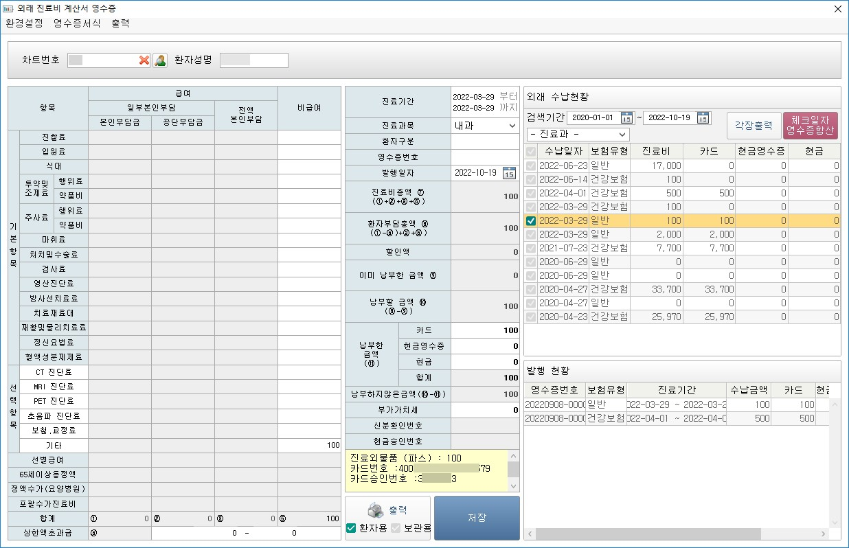 4) [요양기관 임의활용공간] 항목에 카드 결제 정보(카드번호, 승인번호) 표시
