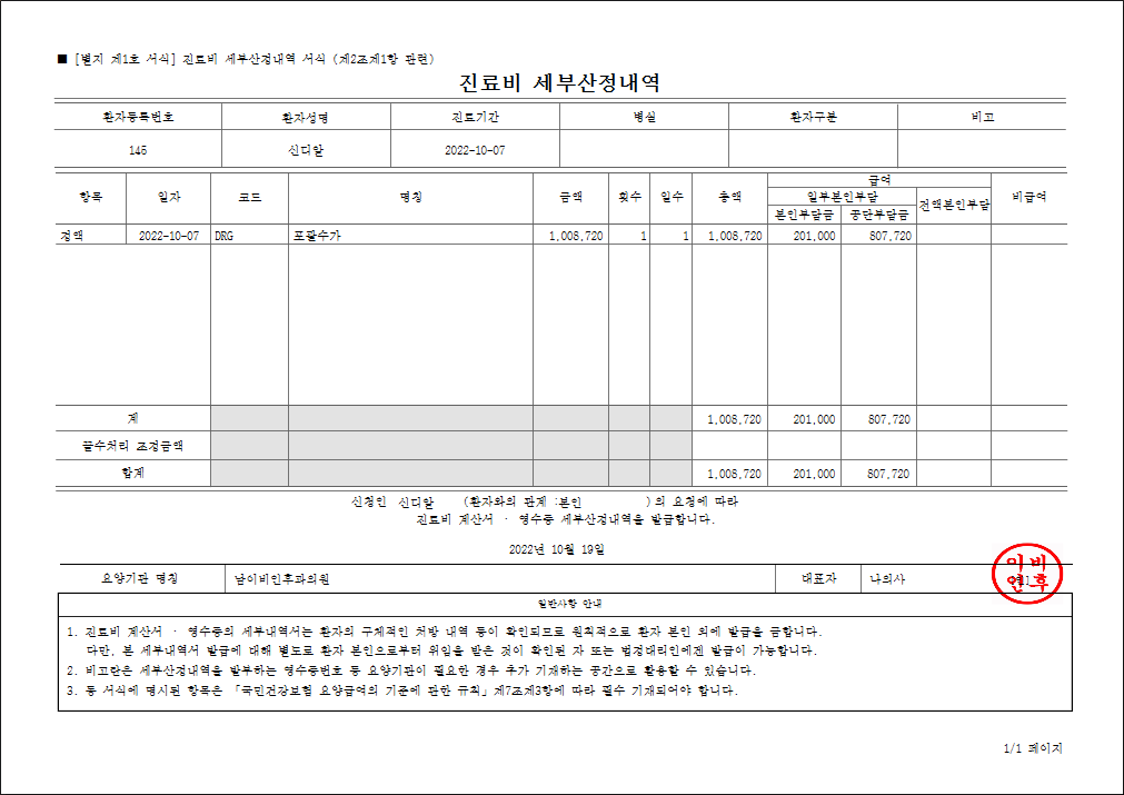 [ DRG 진료비세부산정내역서 출력물 화면 ]