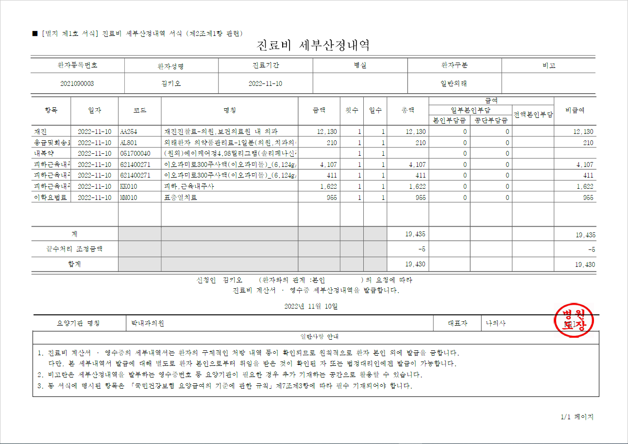 [ 진료비 세부산정내역서 출력물 화면 ]